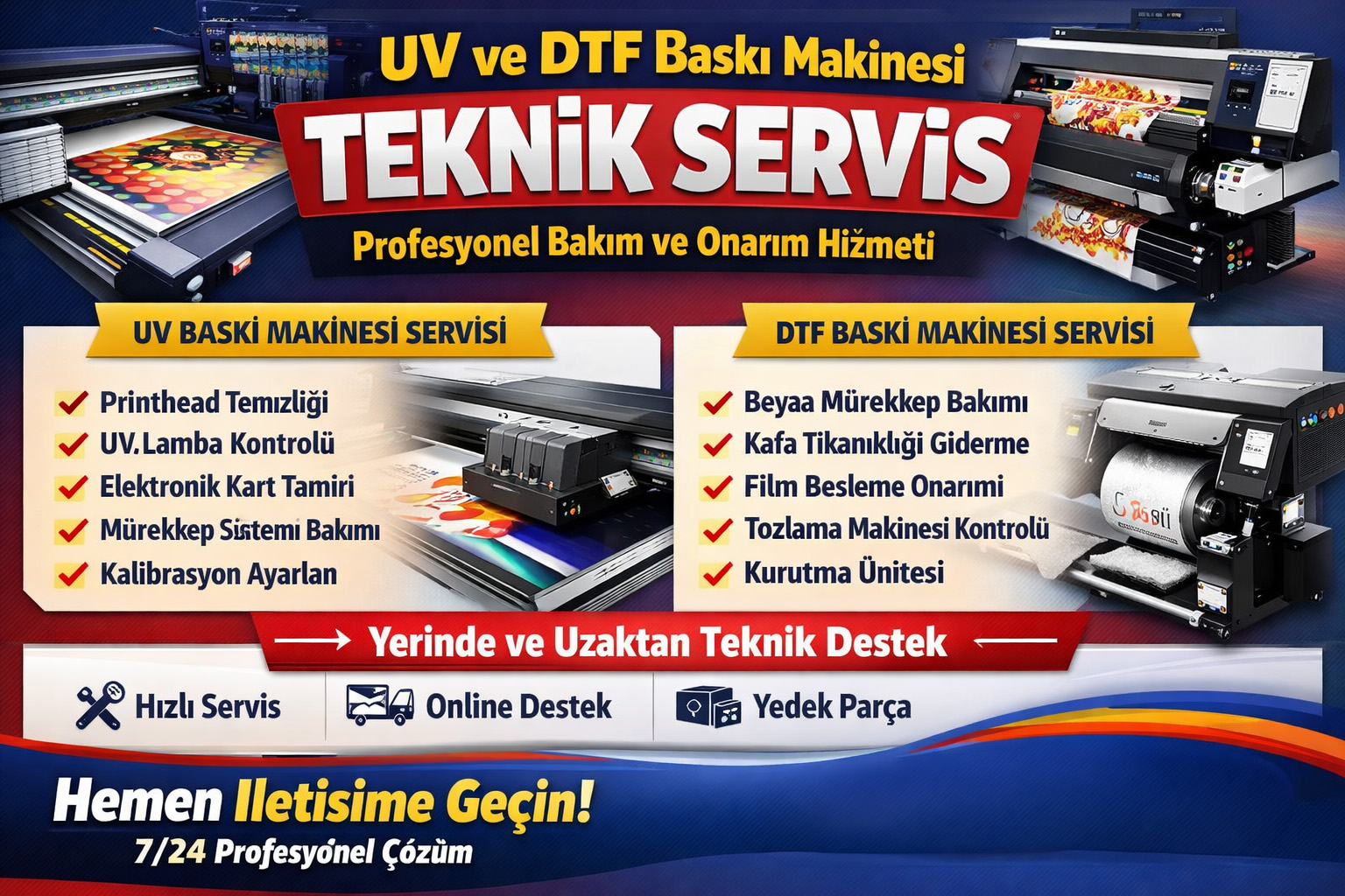 UV baskı makinesi ve DTF baskı makinesi kullanıcıları için en önemli konulardan biri, cihazların kesintisiz ve yüksek performansla çalışmasıdır. Baskı kalitesini korumak ve üretim sürecinde aksama yaşamamak için profesyonel teknik servis desteği büyük önem taşır.